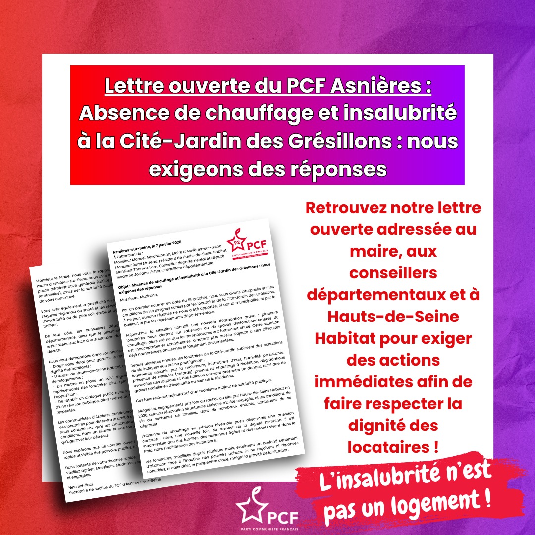 Par un premier courrier en date du 15 octobre, nous vous avons interpellés sur les conditions de vie indignes subies par les locataires de la Cité-Jardin des Grésillons. À ce jour, aucune réponse ne nous a été apportée, ni par la municipalité, ni par le bailleur, ni par les représentants départementaux.